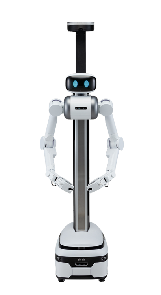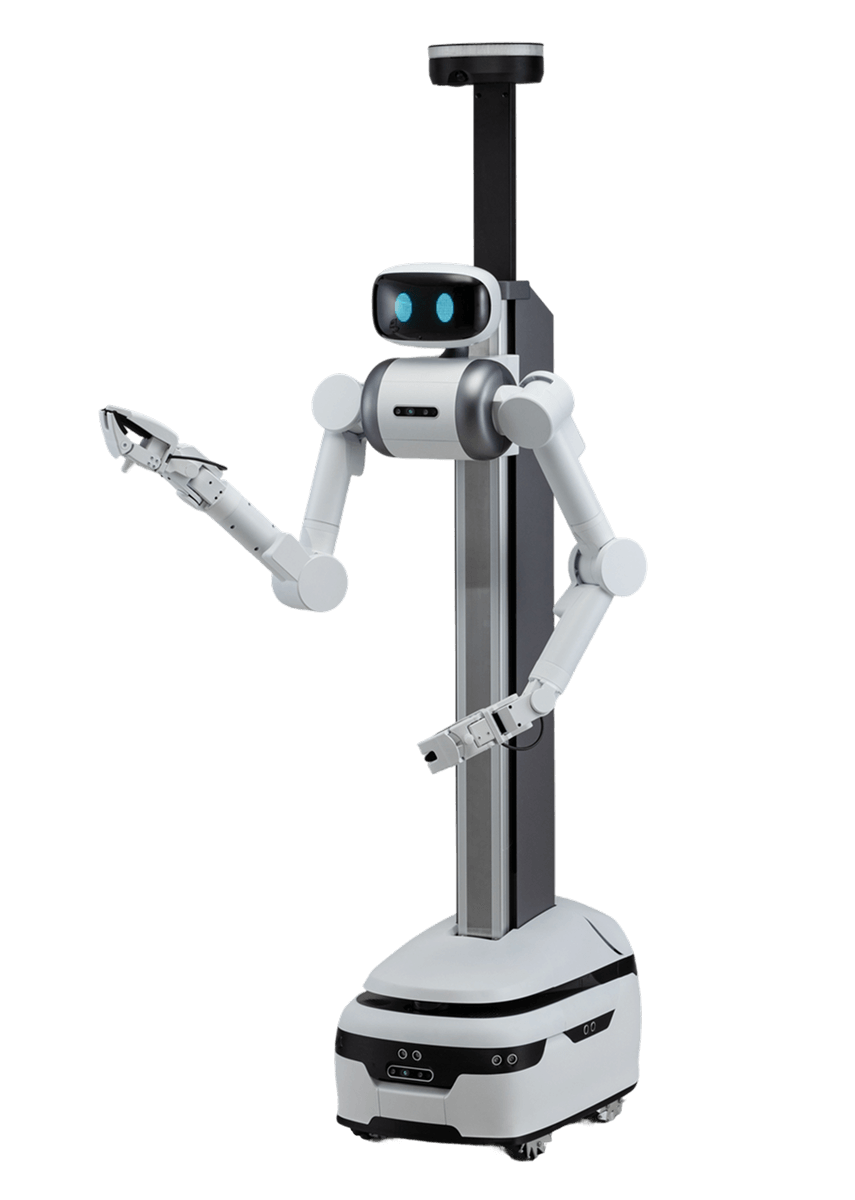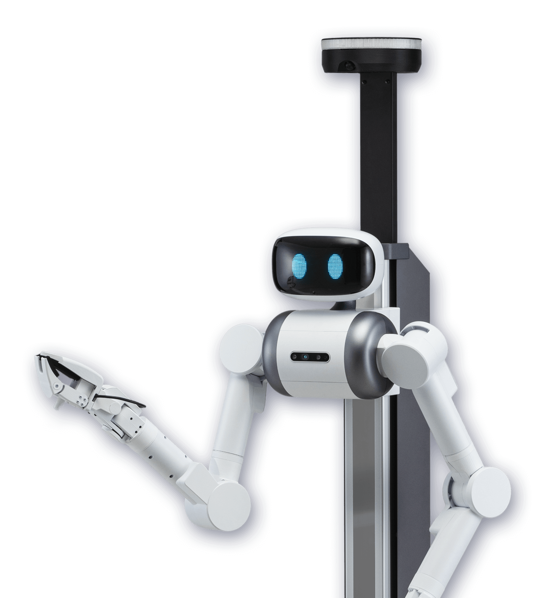 二本のアームでボタン操作やカードタッチが可能。昇降機能により、対象に高さを合わせてスムーズに操作。人のようなジェスチャーやポーズも簡単に設定・実行可能。アームは人や物との接触があると停止し安全性を確保。
