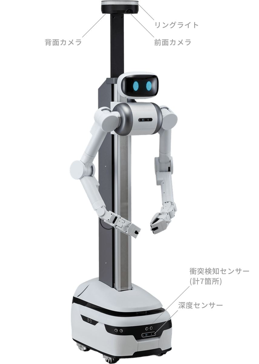 昇降機能により対象の高さを問わず、撮影や読み取りもできます。 巡回警備や設備点検、案内、運搬など幅広い業務に対応。